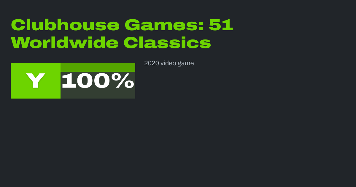 Clubhouse Games: 51 Worldwide Classics, known as 51 Worldwide Games in Europe and Australia, is a 2020 party video game developed by NDcube and published by Nintendo for the Nintendo Switch. This game is a successor to Clubhouse Games (2005) for the Nintendo DS and is a compilation of board, card, tabletop, and toy sports games from around the...