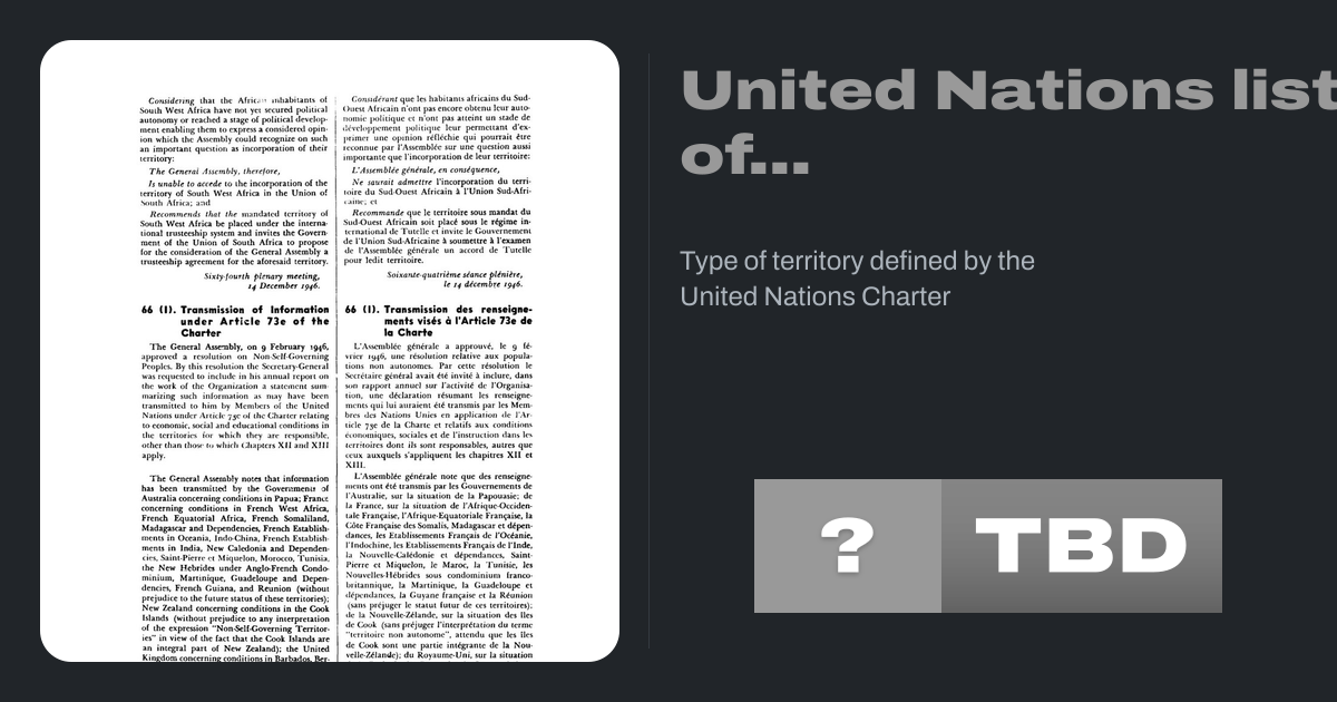 Chapter XI of the United Nations Charter defines a non-self-governing territory (NSGT) as a territory "whose people have not yet attained a full measure of self-government". Chapter XI of the UN Charter also includes a "Declaration on Non-Self-Governing Territories" that the interests of the occupants of dependent territories are paramount and...