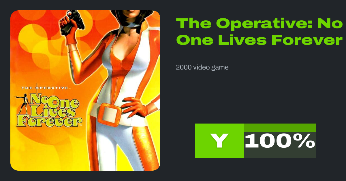 The Operative: No One Lives Forever (abbreviated as NOLF) is a first-person shooter video game with stealth gameplay elements, developed by Monolith Productions and published by Fox Interactive, released for Windows in 2000. The game was ported later to the PlayStation 2 and Mac OS X in 2002.